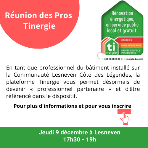 Une réunion de présentation du dispositif Tinergie est organisée le9 décembre de 17h30 à 19h, salle Argoat à l'hôtel communautaire, 12 boulevard frères des lumières à Lesneven.