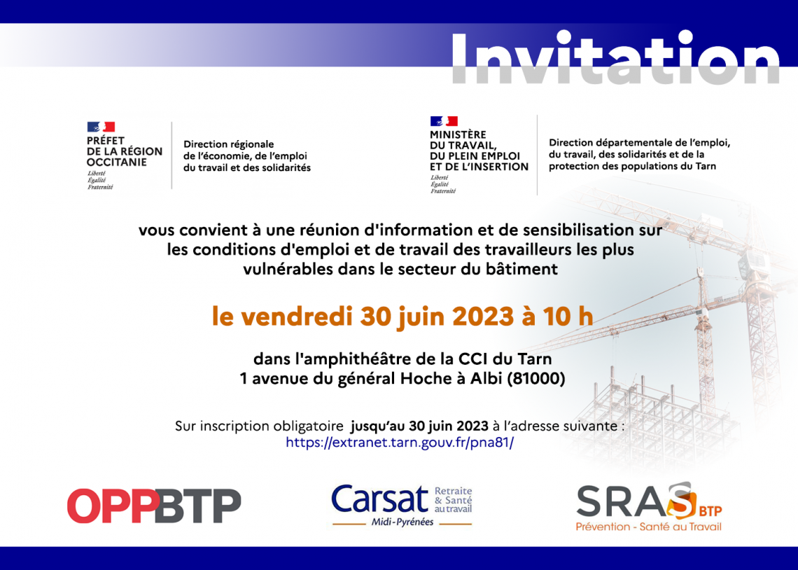 La Région Occitanie, le Ministère du travail avec l'OPPBTP, la CARSAT et le SRAS vous convient à une réunion d'information et de sensibilisation sur les conditions d'emploi et de travail des travailleurs les plus vulnérables dans le secteur du bâtiment