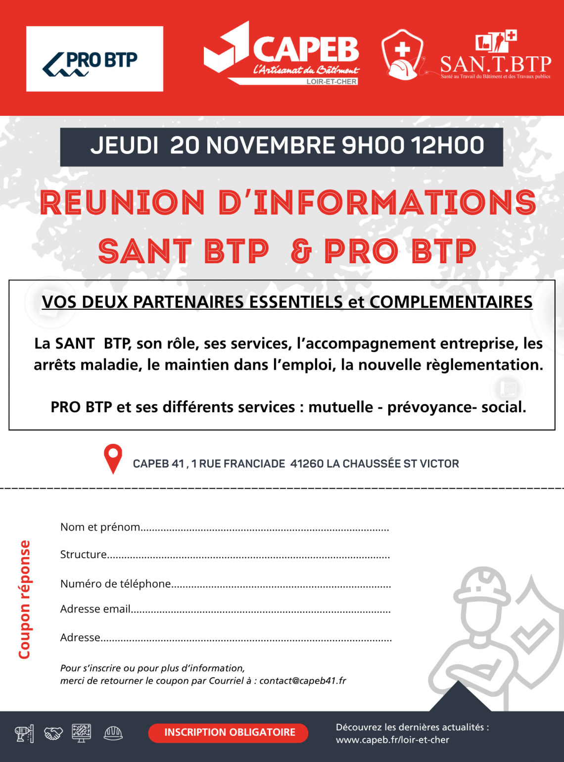La CAPEB 41 vous invite à une réunion d’informations animée par SAN.T.BTP et ProBTP, dédiée à la protection sociale et à la santé des professionnels du bâtiment.
