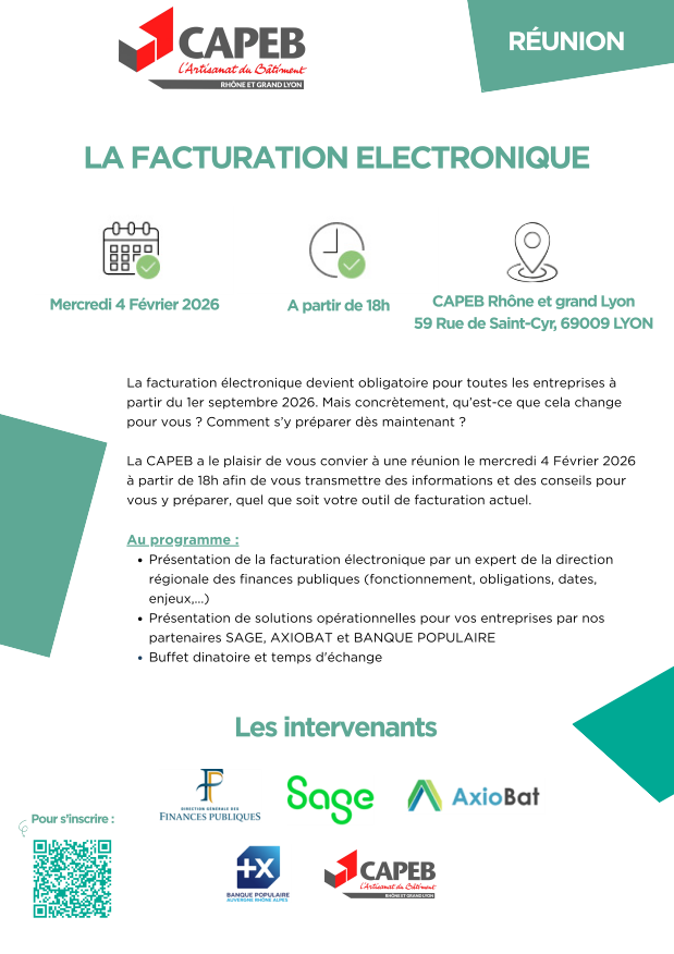 La CAPEB a le plaisir de vous convier à une réunion le mercredi4 Février 2026 à partir de 18h, dans ses locaux au 59 rue de Saint-Cyr,69009 LYON, afin de vous transmettre des informations et des conseils pour vous y préparer, quel que soit votre outil de facturation actuel.