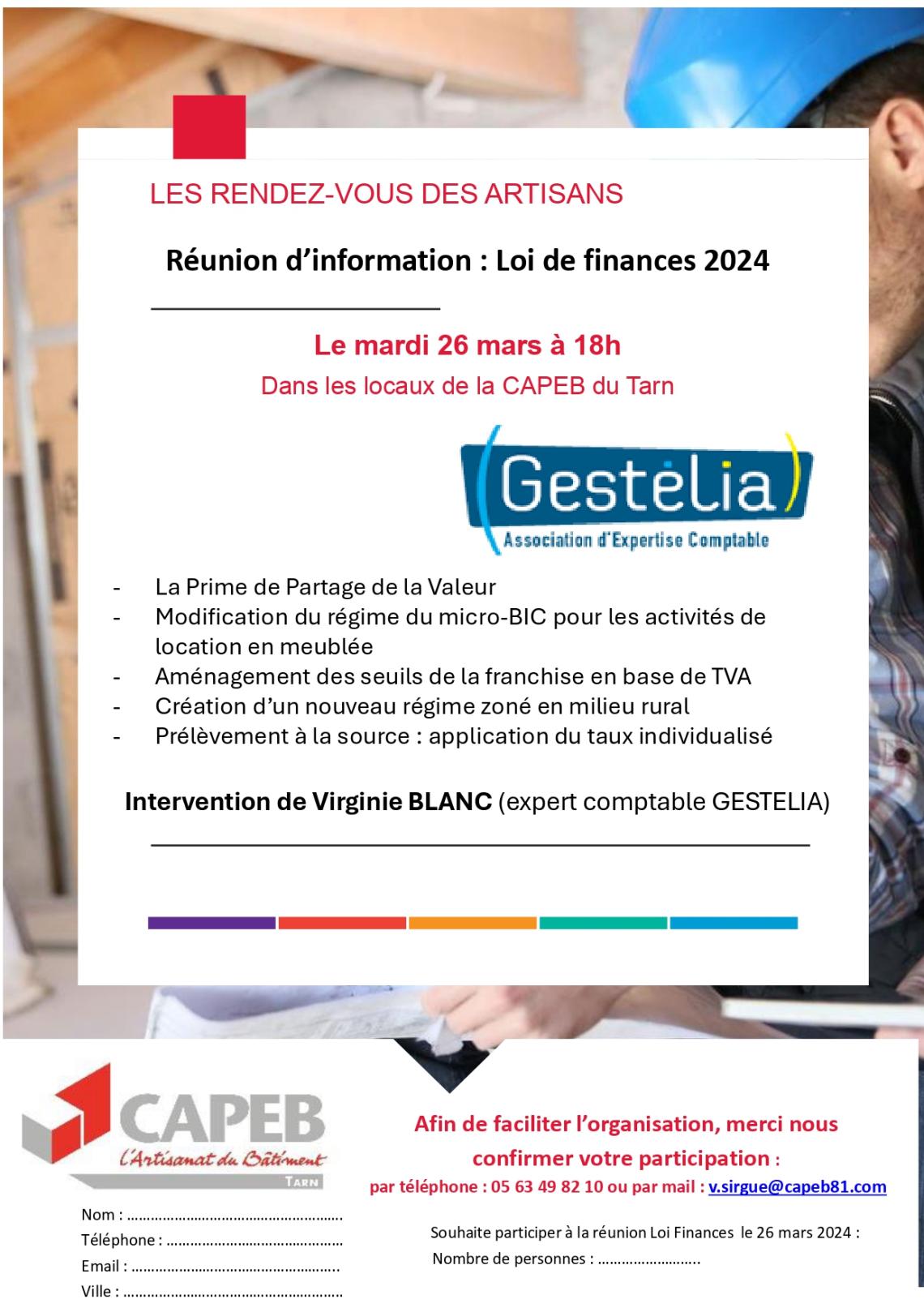 Réunion Loi de Finances 2024 La CAPEB du Tarn a le plaisir de vous convier à une présentation sur la Loi de Finances 2024, animée par Gestelia, mardi 26 mars 18h Inscrivez vous !