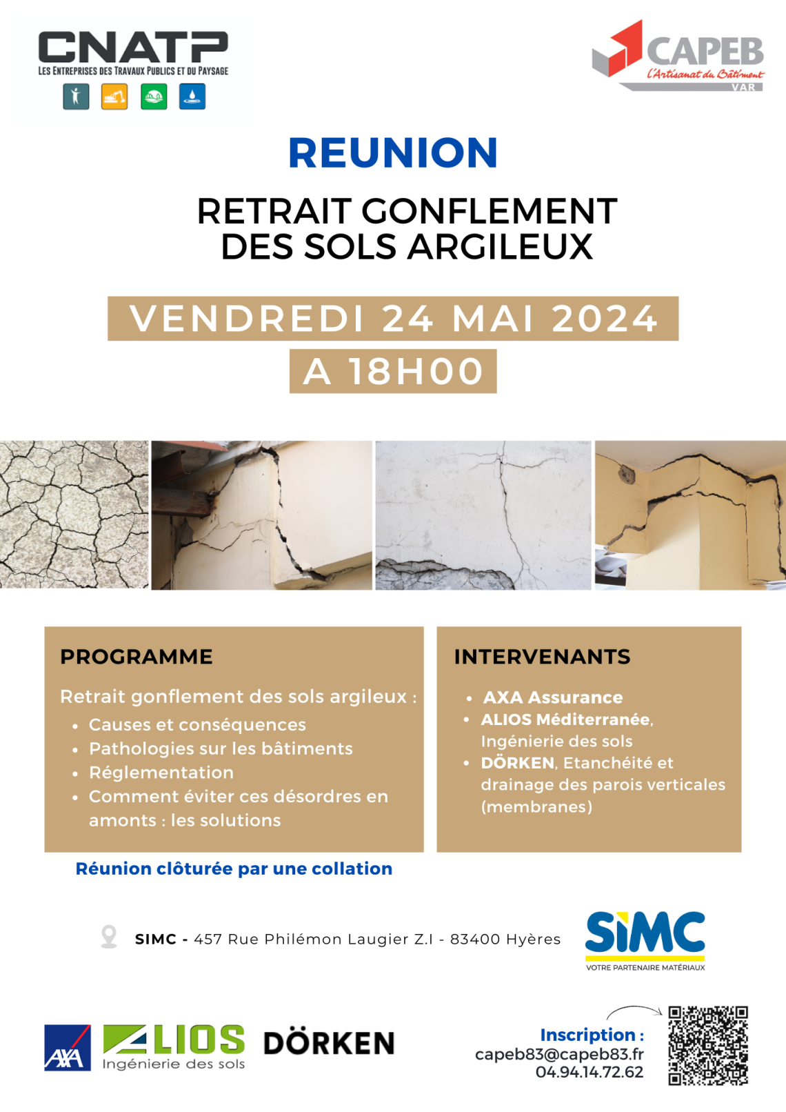 Réunion : Retrait gonflement des sols argileux Inscription en cliquant ICI ou par mail : capeb83@capeb83.fr