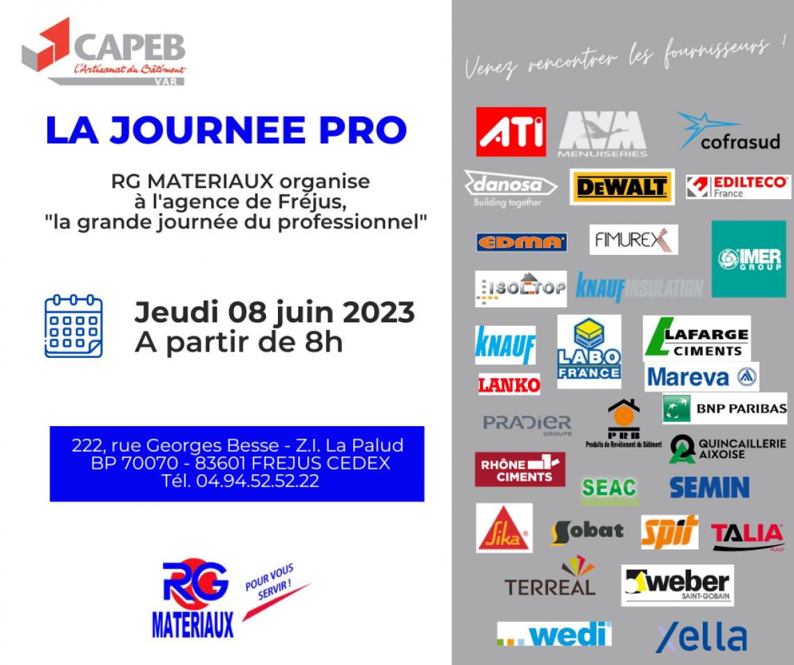RG MATERIAUX organise à l’agence de Fréjus,« la grande journée du professionnel », ce Jeudi 08 juin 2023 à partir de 8h !