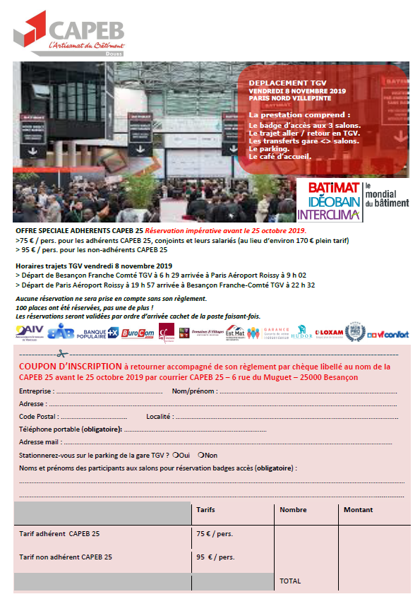 Pour vous inscrire et profiter d'une réduction spéciale adhérent CAPEB 25, il vous suffit de compléter le coupon d'inscription, envoyé par voie postale.