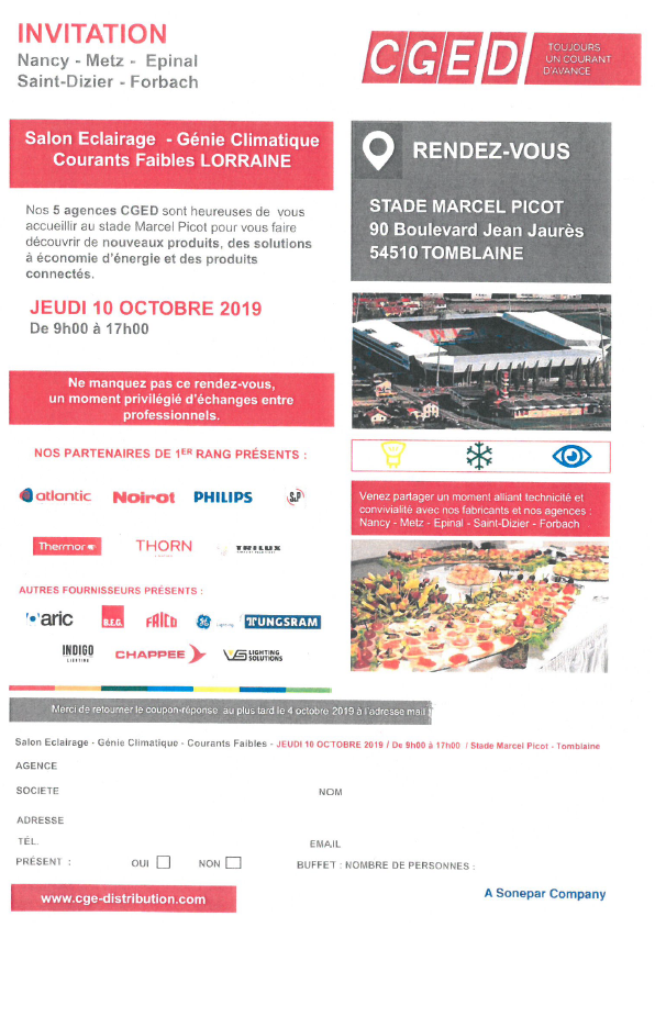 Salon Éclairage-Génie Climatique Courants Faibles LORRAINE La CGED vous donne rendez-vous Jeudi 10 Octobre 2019 de 9H00 à 17H00 au STADE MARCEL PICOT