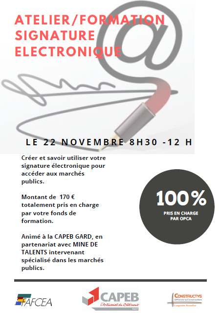 Le cout est de 170 € totalement pris en charge par votre OPCA. Pensez à contacter Stéphanie BARRE : formation@capeb30.fr
