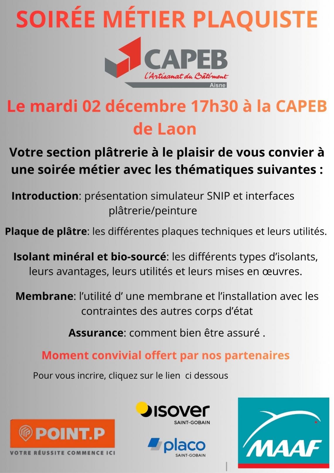 SOIRÉE MÉTIER - PLAQUISTE- Votre section Plâtrerie à la plaisir de vous convier à une soirée métier : Pour vous inscrire, c'est ICI