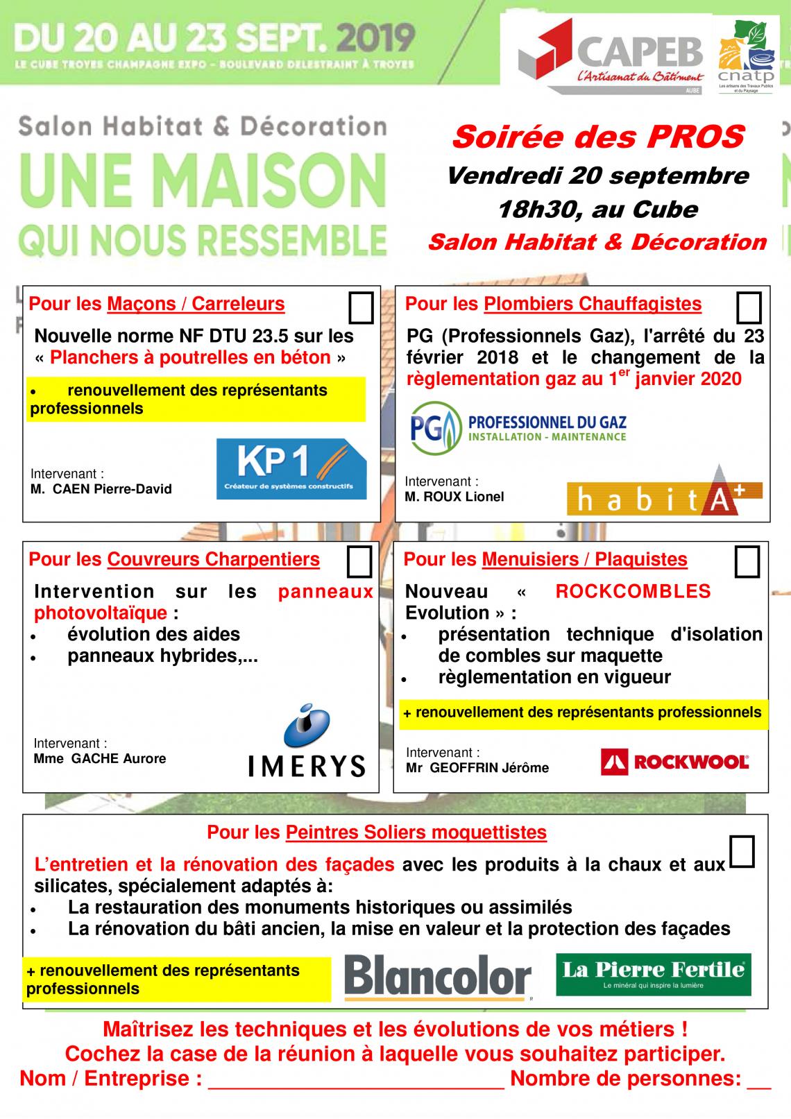 Vous trouverez ci-dessus, l’invitation à la prochaine Soirée des Pros qui se déroulera le vendredi 20 septembre 2018, à 18H30 sur le Salon Habita t& Décoration, dans l’espace restauration. A l’issue de ces rencontres, nous partagerons le verre de l’amitié tous ensemble. Inscrivez-vous vite et venez avec vos collègues !