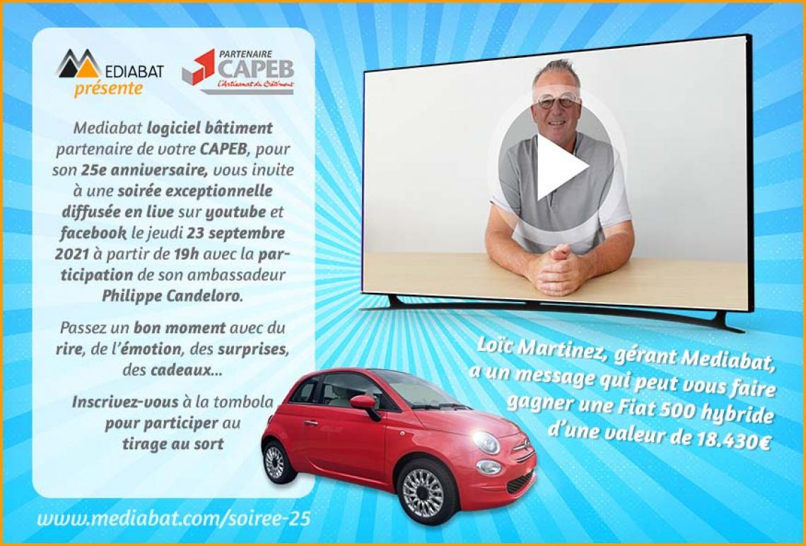 MEDIABAT logiciel Bâtiment, partenaire de la CAPEB 01, vous invite Jeudi 23 septembre 2021 à une soirée exceptionnelle ! En savoir plus sur : https://www.mediabat.com/soiree-25/