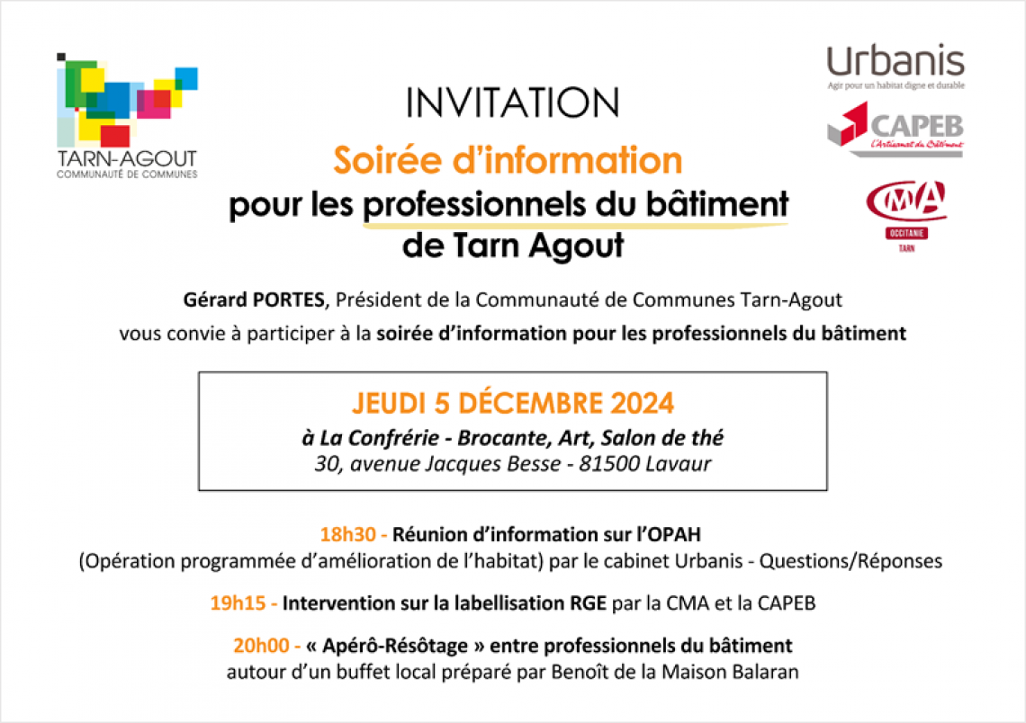 Jeudi 5 décembre se prépare une soirée pour les professionnels du Bâtiments de Tarn-Agout (Artisans, architectes, agences immobilières, décorateurs d’intérieurs, boutiques spécialisés). Cette soirée a pour but de vous informez sur le dispositif OPAH***en Tarn Agout, de vous faire découvrir un nouveau lieu atypique de Lavaur, ainsi que de partager un moment convivial propice à réseautage.