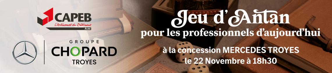 La CAPEB & CNATP de l'Aube, en partenariat avec Mercedes et Artis, est ravie de convier ses adhérents à une soirée exceptionnelle placée sous le signe de la convivialité et de la nostalgie ! Cet événement, intitulé Jeux d'antan pour les pros d'aujourd'hui, se déroulera le 22 novembre et promet une immersion dans l’univers des jeux traditionnels, réinventés pour l’occasion.
