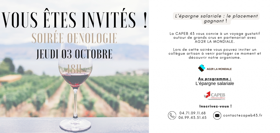 La CAPEB a le plaisir de vous inviter à une soirée exceptionnelle consacrée à l'œnologie, organisée en partenariat avec l'entreprise AG2R. Cet événement, prévu pour le Jeudi 03 Octobre 2024 sera l'occasion de découvrir les subtilités du monde viticole dans une ambiance conviviale et enrichissante.