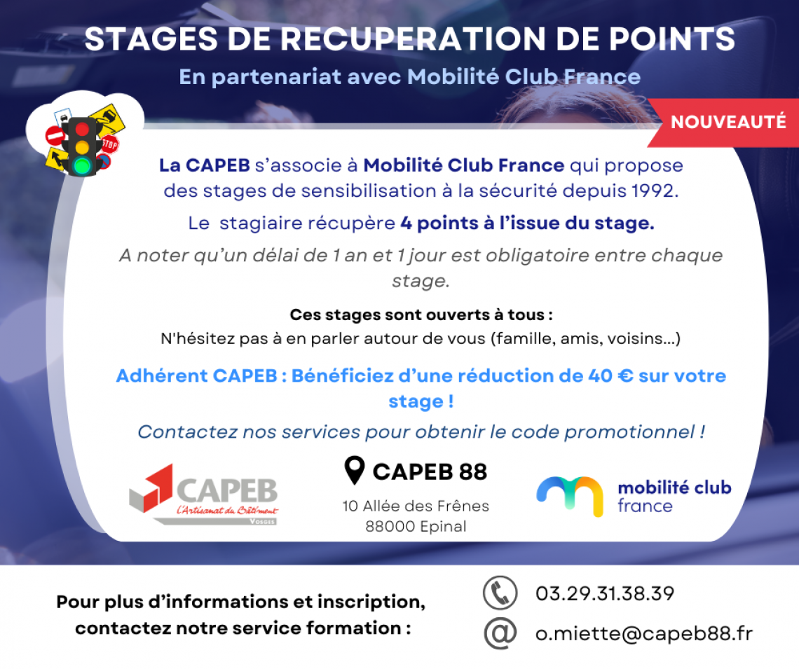 NOUVEAUTÉ : Stages de récupération de points à la CAPEB des Vosges !