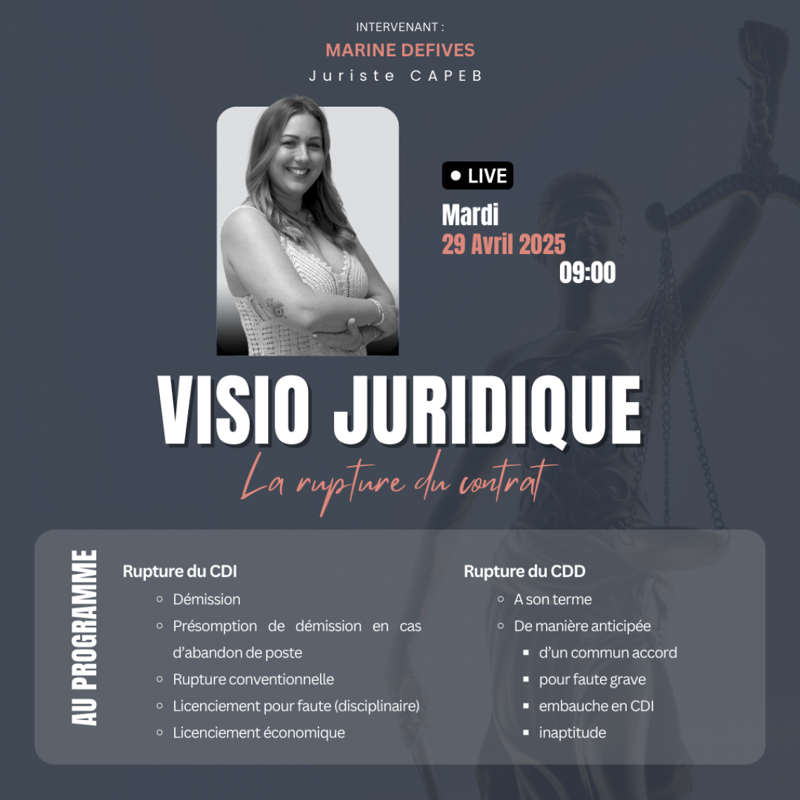 Rejoignez-nous pour notre nouvelle visio juridique sur la rupture du contrat le Mardi 29 Avril 2025 à 9h00 !