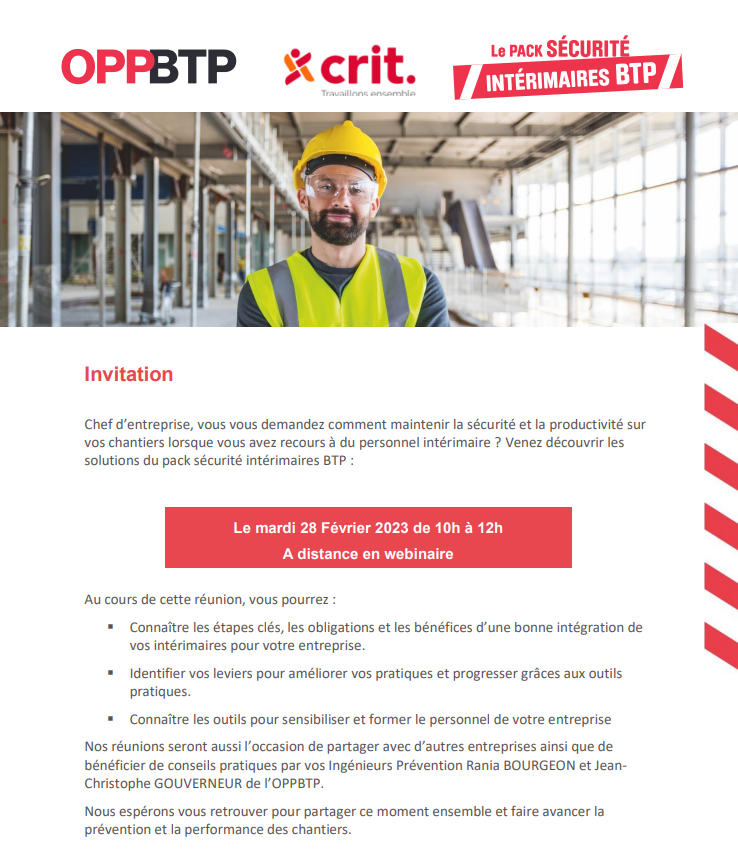 Webinaire à distance sur le pack sécurité intérimaires BTP Inscription obligatoire Pour vous inscrire, cliquez ici.