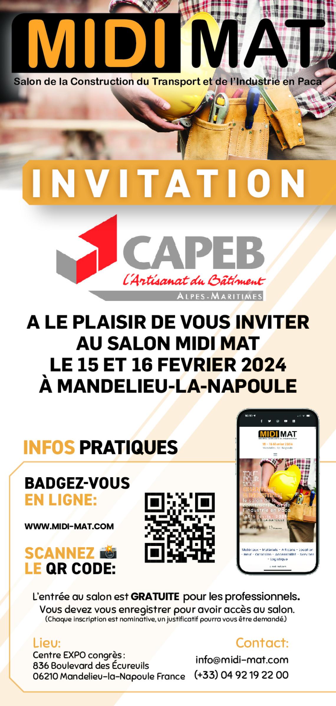 La CAPEB est partenaire du 1er salon MIDI MAT (de la construction du transport et de l’industrie) qui aura lieu au Parc Expo Congrès de Mandelieu La Napoule les 15 et 16 février.