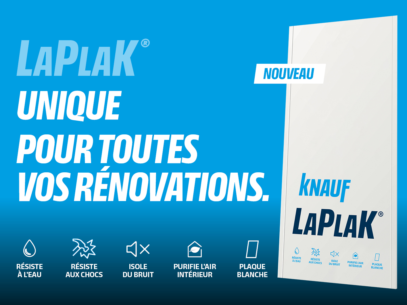 Pour simplifier vos chantiers de rénovation, Knauf a développé LaPlaK®, une plaque de plâtre unique qui traite l’ensemble du chantier et regroupe les bénéfices de plusieurs plaques spécialisées : hydrofuge, isole du bruit, résiste aux chocs, purifie l’air intérieur… LaPlaK de Knauf est la réponse universelle à tous les cas de rénovation.