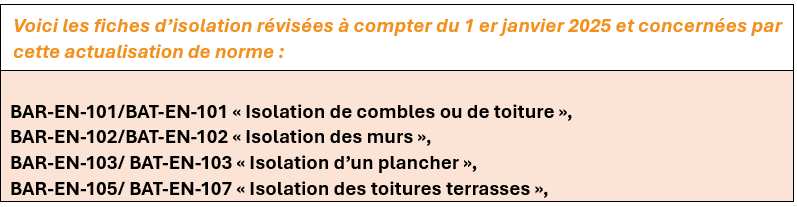 Voici les fiches d’isolation révisées à compter du 1 er janvier 2025 et concernées par cette actualisation de norme.