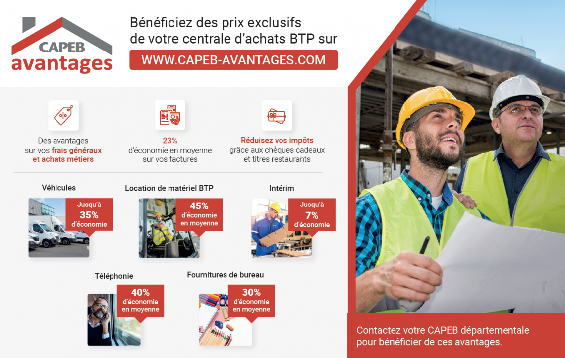 Les prix des matériaux et de l’énergie flambent. Pensez à utiliser la centrale CAPEB AVANTAGES pour faire des économies et optimiser vos dépenses quotidiennes. Pensez à utiliser le réseau CAPEB avec nos partenaires locaux avec qui vous pouvez aussi bénéficier de remises supplémentaires. Découvrez nos partenaires et les offres dans la rubrique "Je bénéficie d'avantages" ci-contre à gauche.