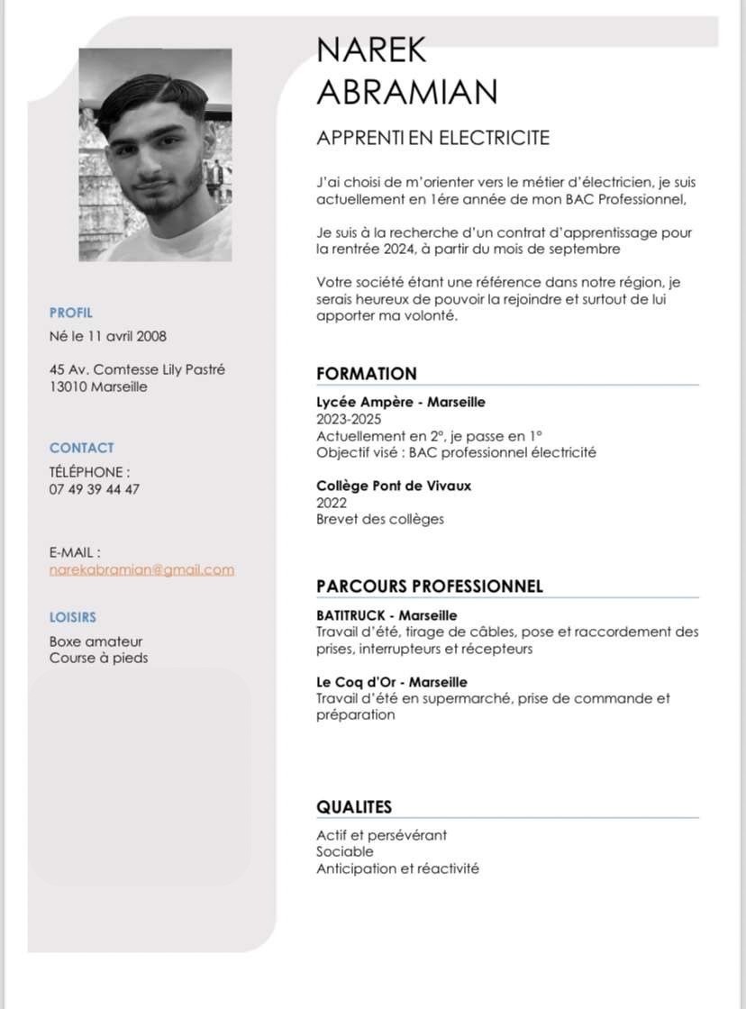 Actuellement à la recherche d'un employeur pour un contrat d'alternance dans le domaine de l'électricité. Passionné par ce secteur, je souhaite acquérir une expérience pratique tout en poursuivant ma formation théorique.