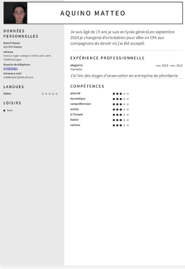 Noah . 16 ans en recherche active et urgente d'un patron pour trouver un contrat Apprentissage le plus vite possible ...