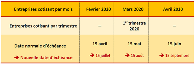 Les entreprises qui ne pourraient remplir leurs obligations de paiement des cotisations pourront différer de trois mois sans majoration, tout ou partie, du paiement de chacune des échéances de cotisations normalement exigibles entre le 16 mars et le 15 juin 2020 inclus.