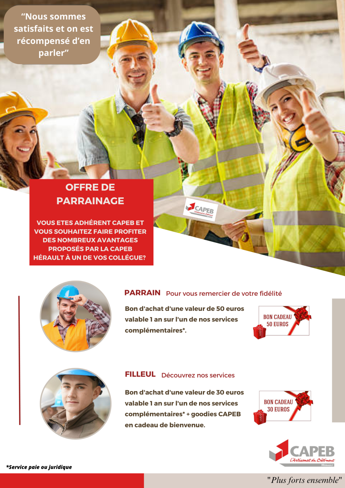 En tant qu'adhérent CAPEB, vous êtes les premiers ambassadeurs de notre Organisation Professionnelle. Parlez en autour de vous et profitez de notre offre de parrainage