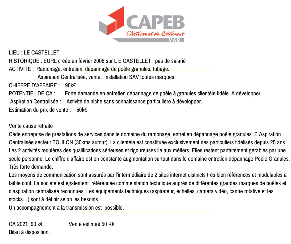 - 05/05/2022 - Vente entreprise Ramonage, entretien, dépannage - Le Castellet -Pour consulter l'annonce cliquez ICI